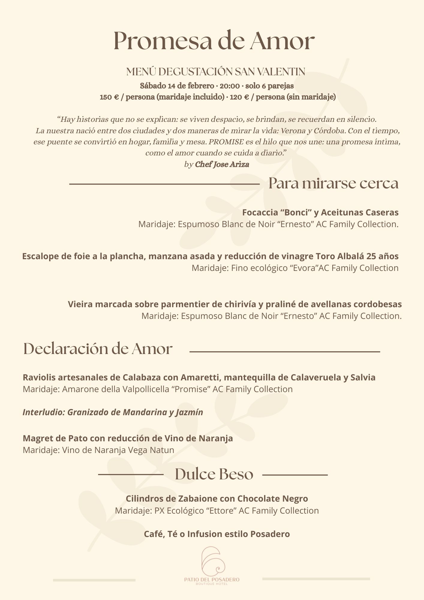 Una noche única para seis parejas. PROMISE es la cena de San Valentín diseñada en exclusiva por nuestro chef y creador, José Ariza, como homenaje al amor del que nace Patio del Posadero: Verona y Córdoba unidas en una mesa.